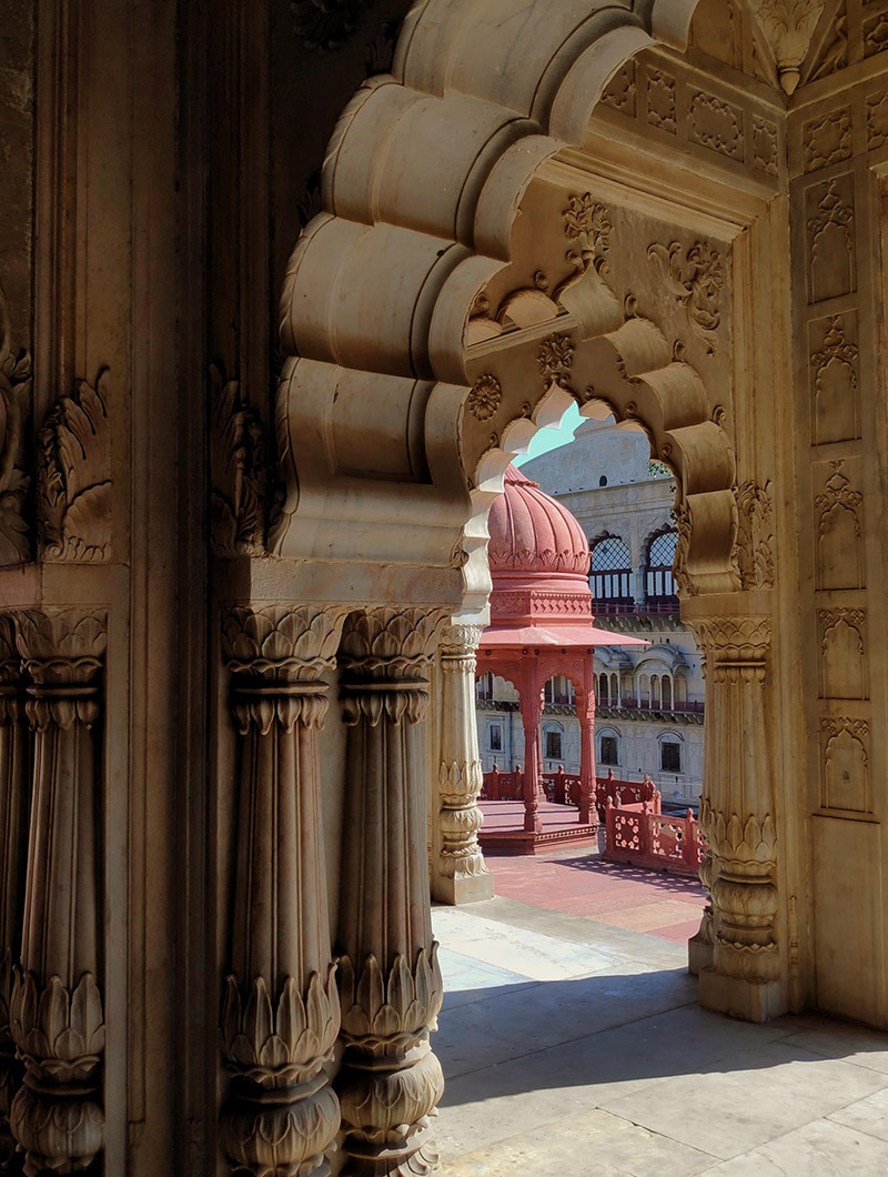 A historic cenotaph dedicated to the Maharani of Alwar, showcasing intricate carvings and stunning architecture.